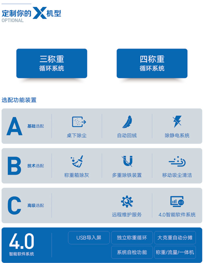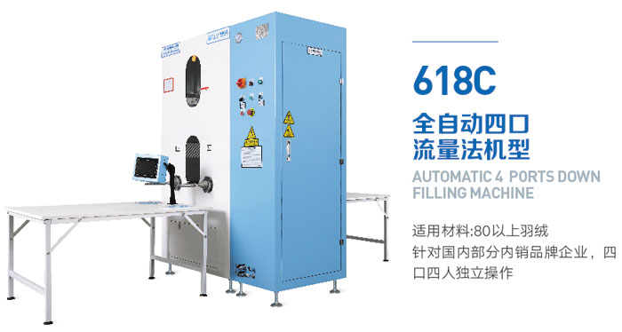 在雙口機型的基礎上升級成四口流量法機型,適用80-90g羽絨,填充范圍0.2-3g,主要針對國內部分內銷品牌企業的應用需求。