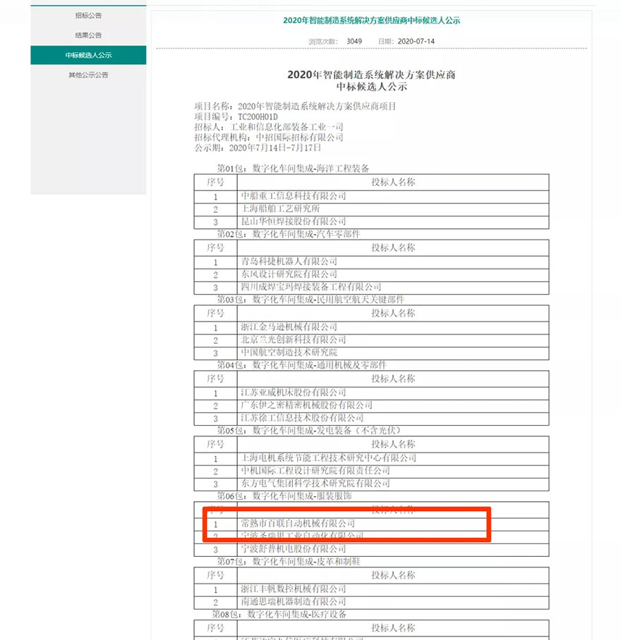 近日,國家工業和信息化裝備工業一司委托招標代理機構中招國際招標有限公司公示了“2020年智能制造系統解決方案供應商”中標候選人名單。我司(常熟市百聯自動機械有限公司)經過與多方競爭及嚴格篩選成為中標候選人,成功中標“數字化車間集成-服裝服飾”項目。