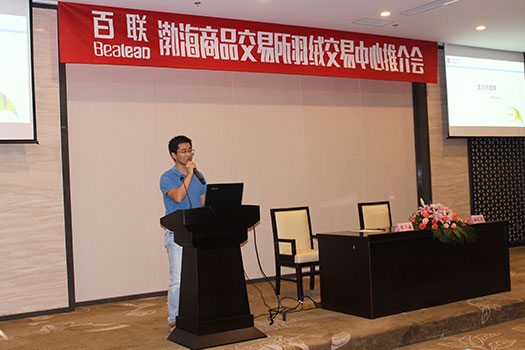 百聯總裁錢衛波致歡迎辭,他介紹了百聯企業良好的發展現狀,感謝大家對百聯一如既往的支持,感謝渤交所羽絨交易中心為我們搭建了一個全球性的電子交易平臺,羽絨電子化交易是今年行業的一個重要創舉,渤交所為企業提供最優的交易服務,而百聯致力為企業提供最好的設備支持。